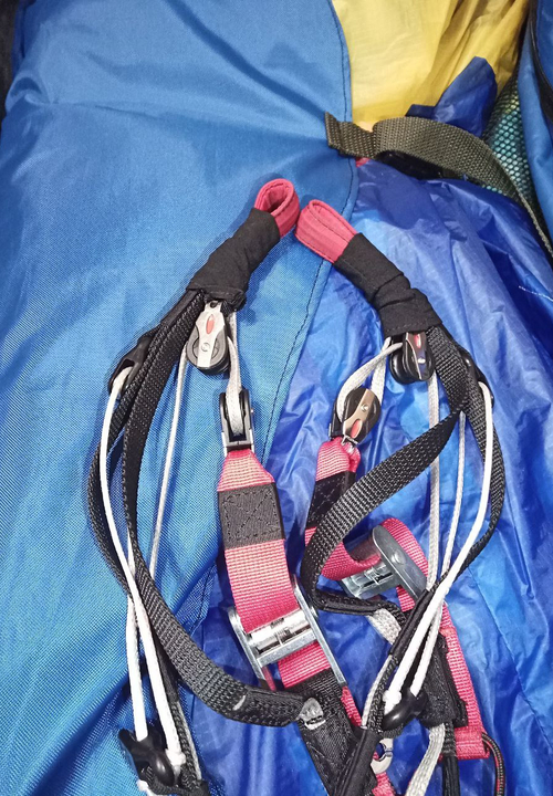 На параплане внедрено "2D-управление" - от клеванты уходят две управляющие стропы, которые идут к разным частям задней поверхности и позволяют эффективно рулить парапланом, не притормаживая его на высоких скоростях.
